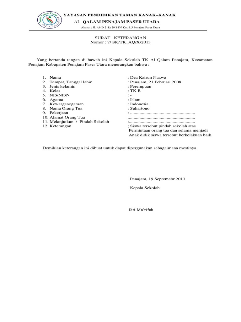 Download Surat Keterangan Pindah Sekolah Anak Paud Format Word Asdar Edu