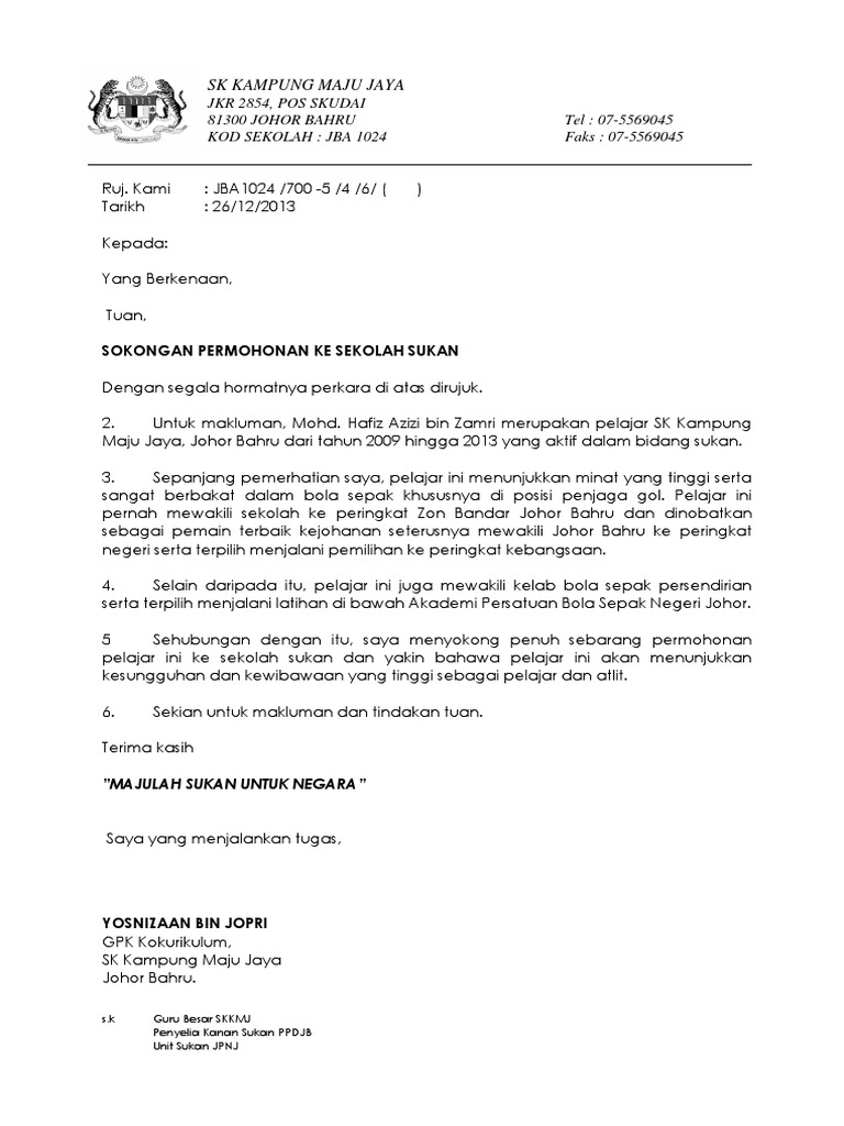 Surat Sokongan Permohonan Ke Sekolah Sukan