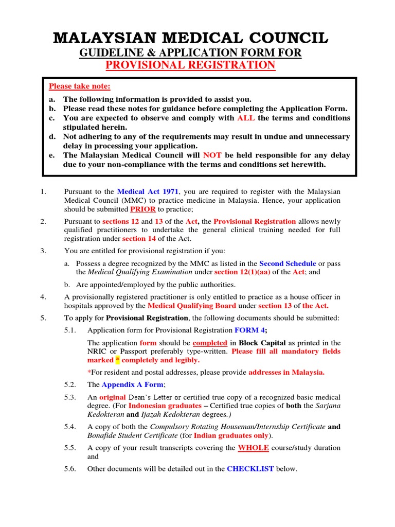 Malaysian Medical Council Guidelines And Application Form For Provisional Registration