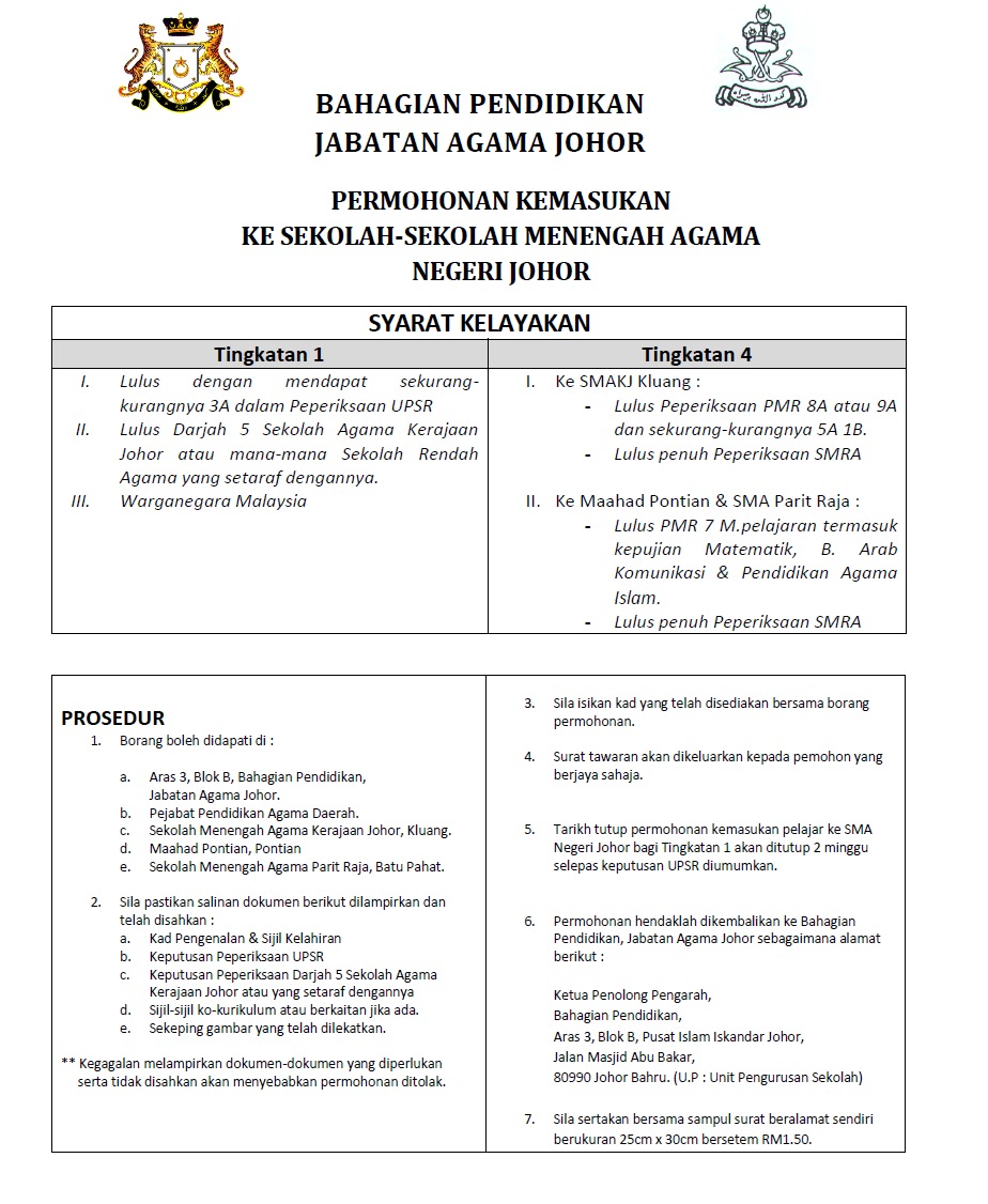 Pejabat Pendidikan Agama Daerah Johor Bahru Syarat Kelayakkan Permohonan Ke Smakj Kluang Maahad Pontian Sma Parit Raja Sesi 2011